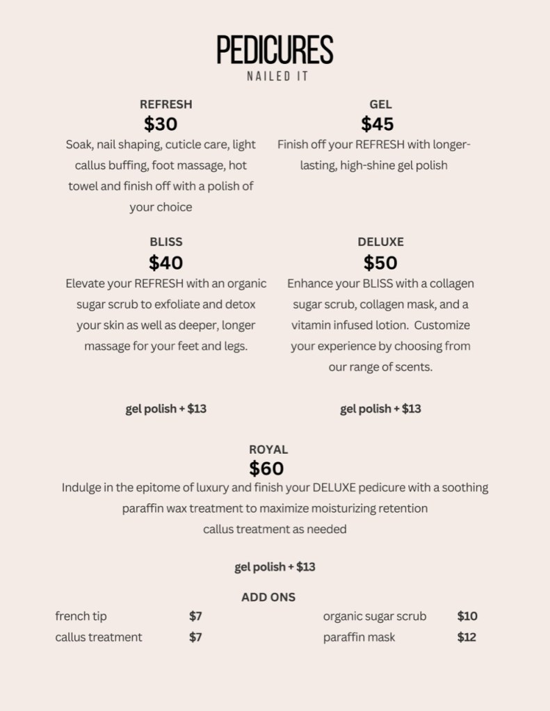 Thank you for choosing Nailed It for your beauty needs. We’re committed to providing you with exceptional service and value, and we look forward to helping you look and feel your best. If you have any questions or concerns about our pricing or services, please don’t hesitate to reach out to us.